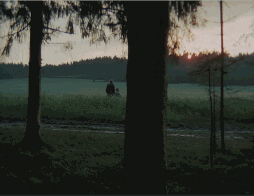 A:我特别喜欢塔可夫斯基的《镜子》结尾的那一段。主角在巴赫音乐中回忆母亲,在一片草原上,镜头突然沉下来,一个女人和一个男人坐在地上,之后推到远处的房子,老人和小孩走出来。整个过程都在拍水坑、树枝之类,有一种田园诗意。